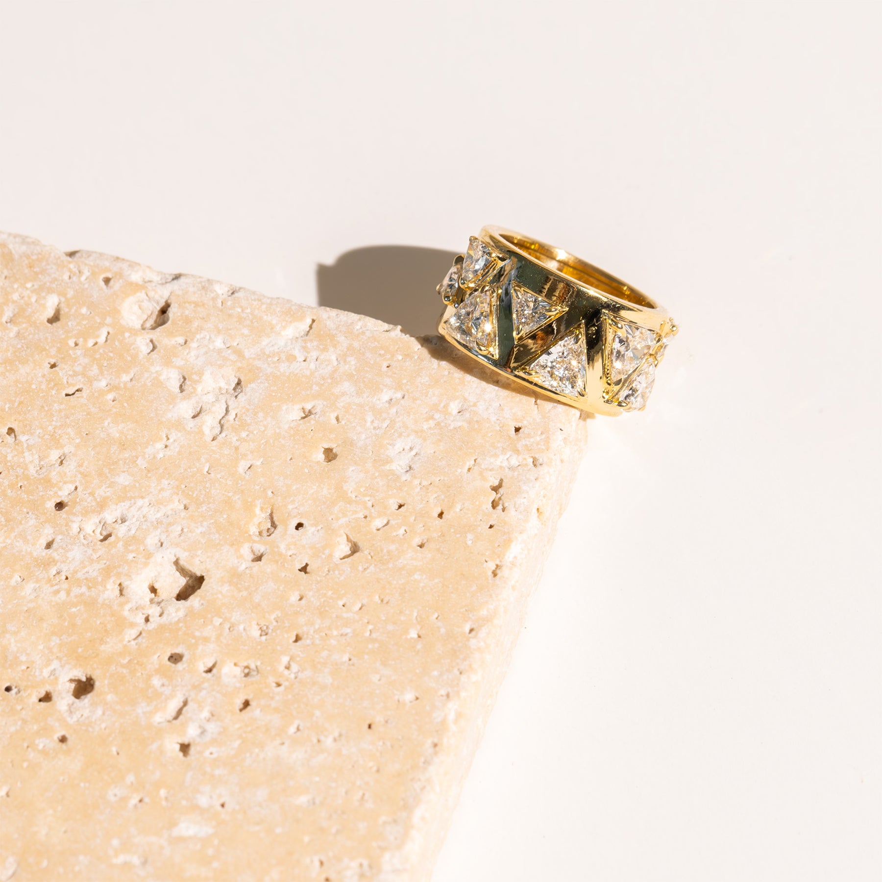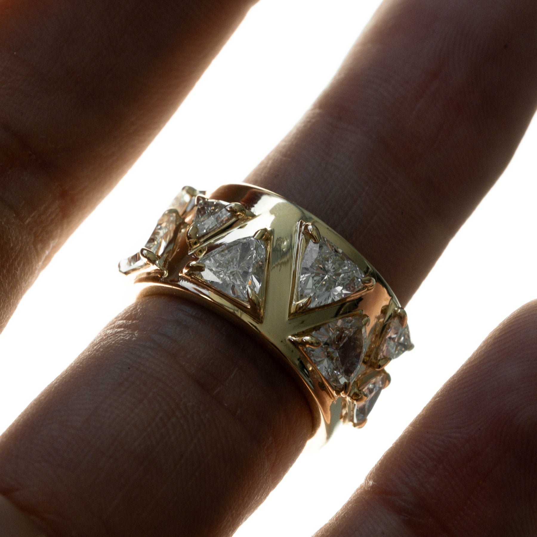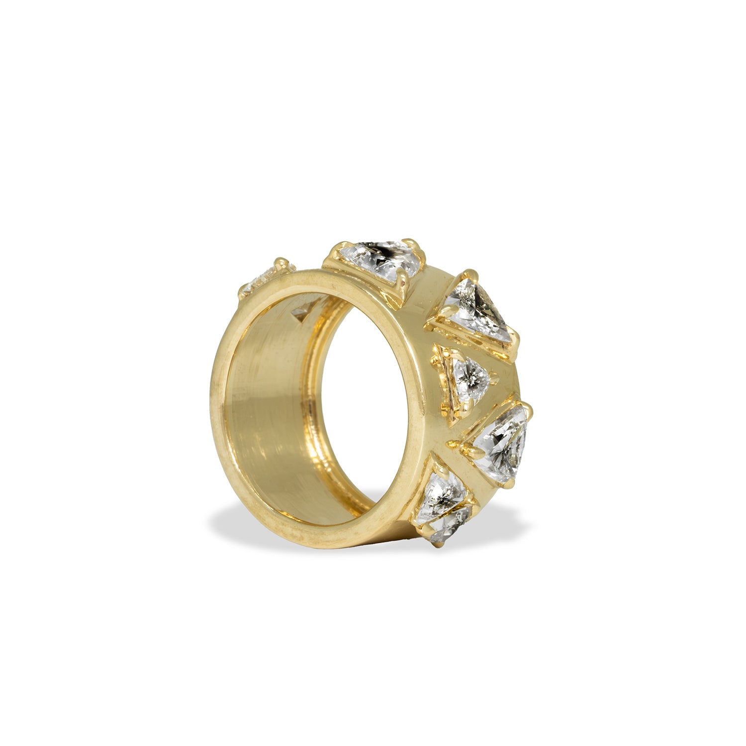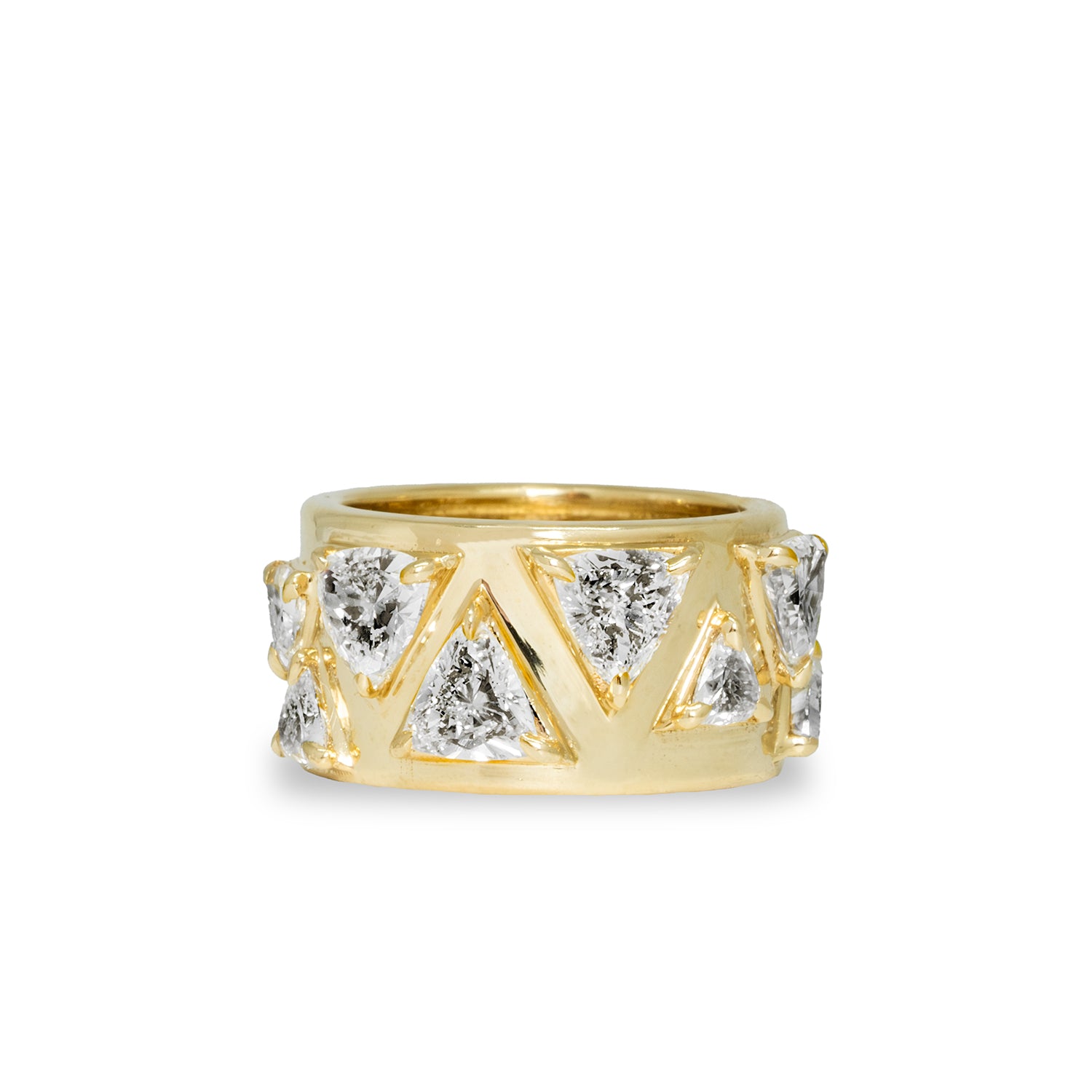 Encircle your finger with scattered sizes of 9 trillion cut lab grown diamonds set on a wide cigar band.