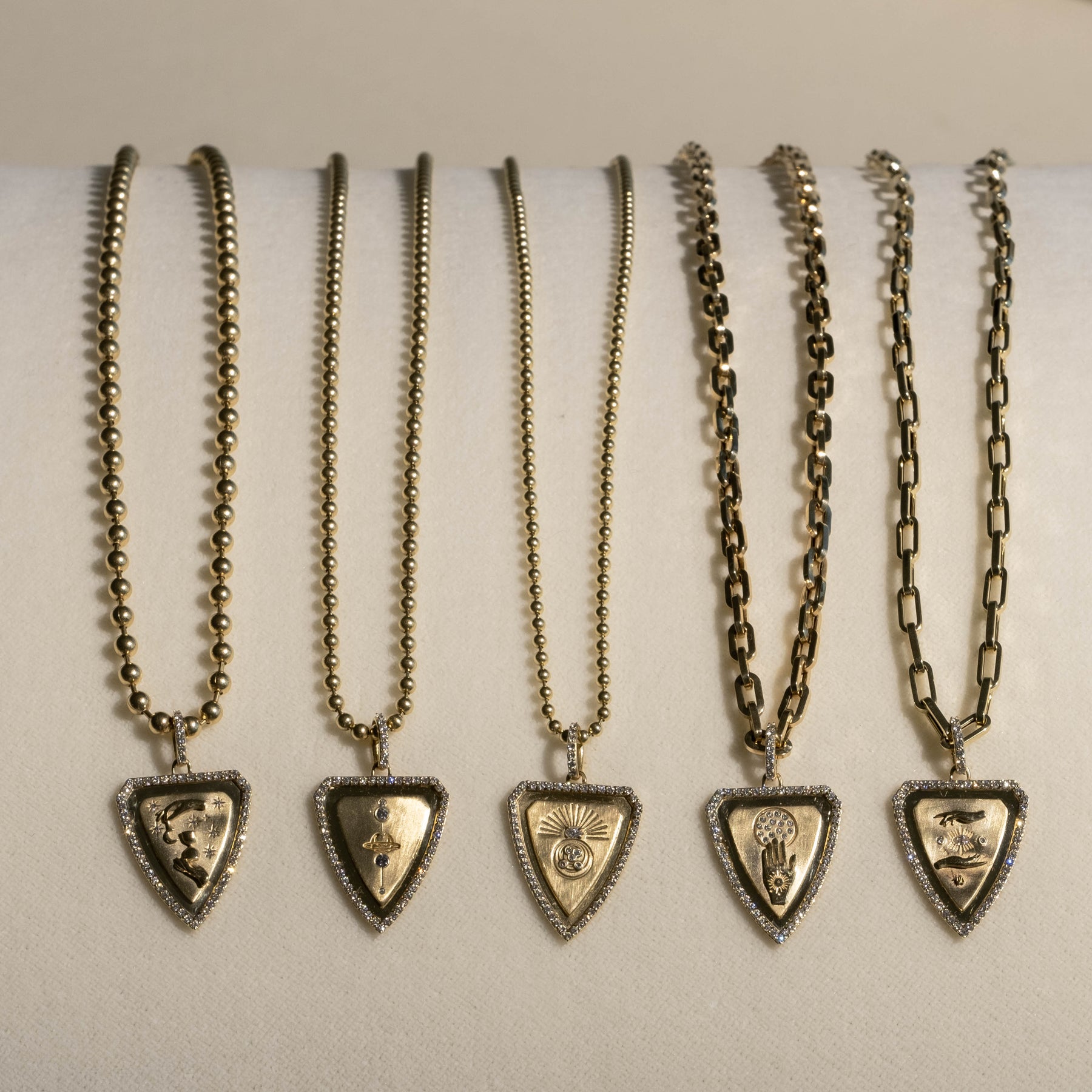 Crafted from 14k yellow gold and lab grown sparkling diamonds, each shield pendant is a miniature work of art, intricately engraved with symbols representing the major arcana and minor arcana of the tarot. From the expansive Four of Cups to the protective Queen of Swords, each pendant serves as a gateway to the mysteries of the soul and the secrets of the universe.