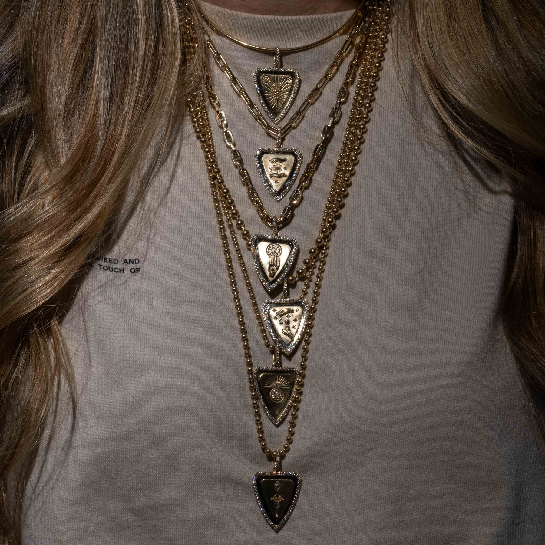 The Abundance Shield symbolizes the fulfillment of dreams and the joy of achieving your goals. It serves as a constant gentle reminder to embrace a mindset of gratitude for the blessings you already have. This shield encourages you to savor the present, celebrate your accomplishments, and bask in rewards of your hard work, all while staying mindful of the endless potential of the universe and capacity for one’s own growth. Crafted from solid 14k gold, adorned with pave lab grown diamonds around the border and within. There is a custom pave diamond bale that fits a chain through up to 4mm. Chain sold separately.