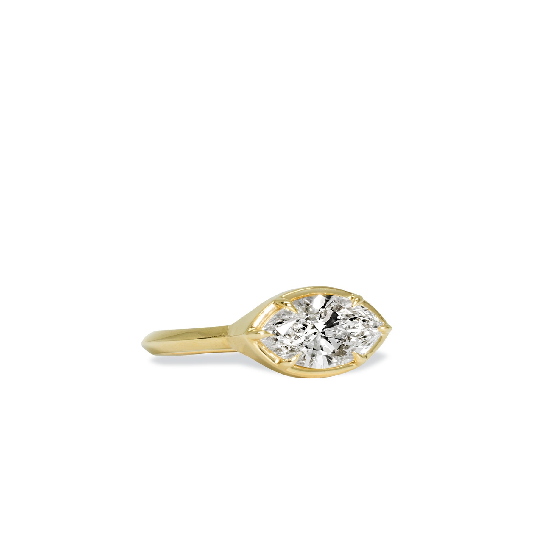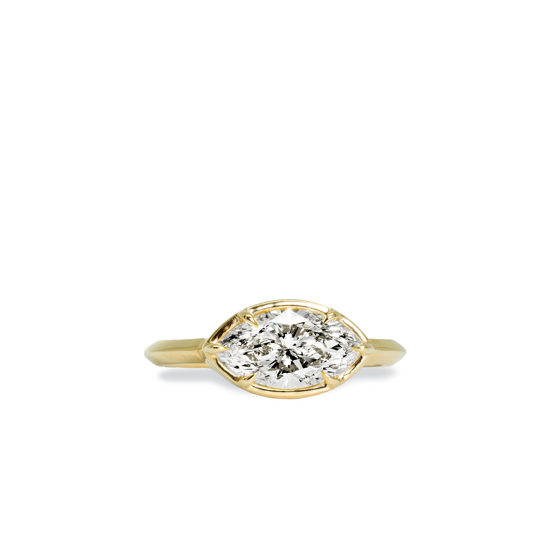 A modern essential with a sharp edge. The Marquise Knife Edge Solitaire Stacking Band features a single round cut 1 carat lab grown diamond set on a sleek knife edge band of solid 14k gold. The refined silhouette catches light along its ridged contour, creating a subtle shimmer even before the diamond sparkles.